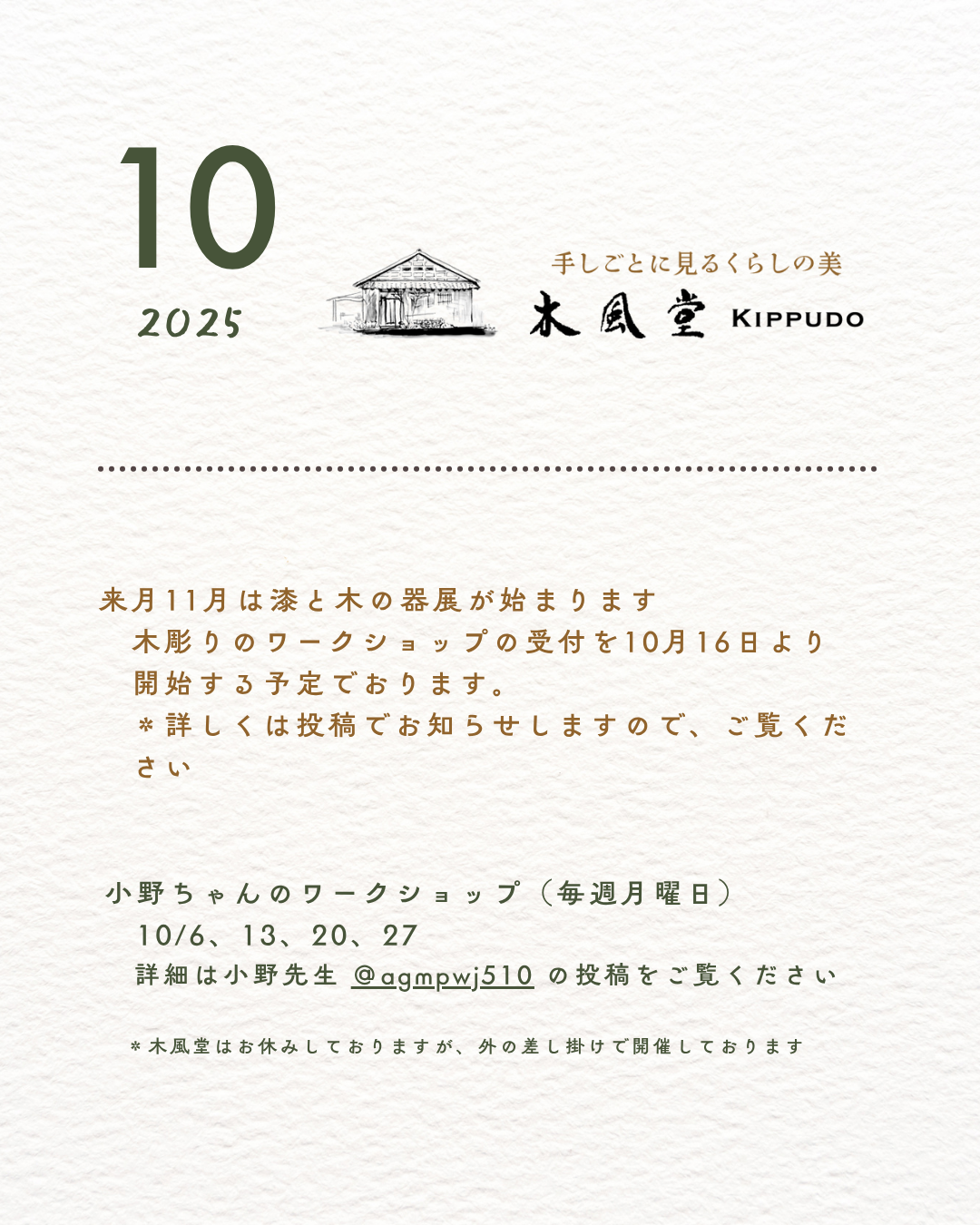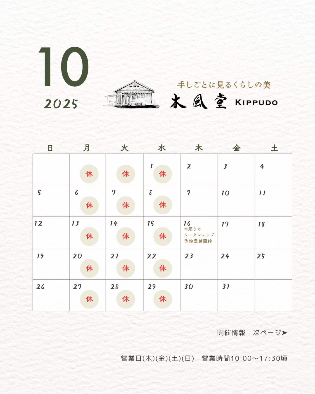 木彫りのワークショップの受付を10月16日(木)より開始する予定でおります。